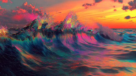 A serene ocean wave crashing at sunset with a vibrant sky