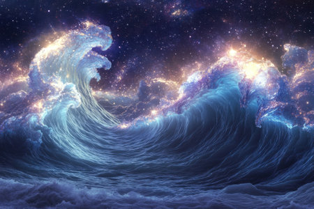 Powerful waves surge towards the shore, illuminated by shimmering light against a cosmic backdrop.