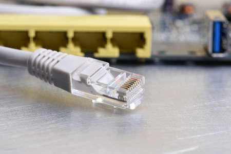 Rj45 cable and network card slot. Cable for data transmission in a computer network. Dark background.