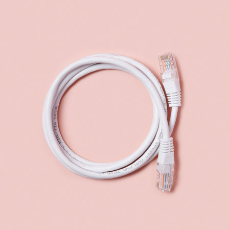 Square shot of ethernet cable on a pink background. LAN blue on a pink background.