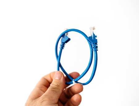 Man holding in hand against white background blue Ethernet internet cable to connect to fast-speed gigabit internet network