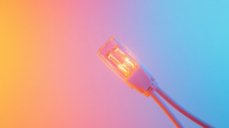 Network cable with internet symbol glows against a colorful gradient background, representing modern technology and connectivity solutions for users.