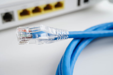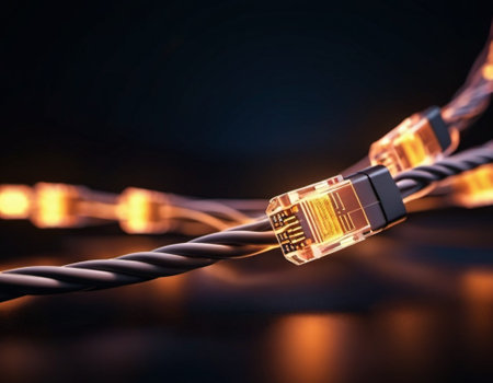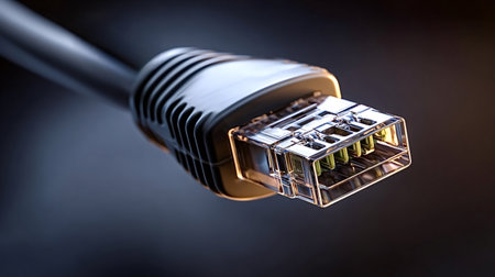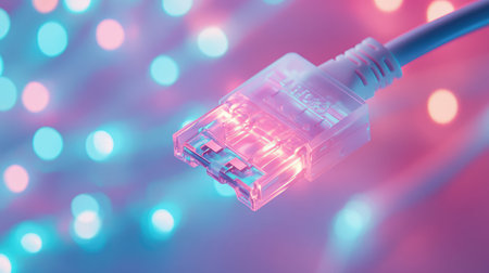This close-up image features a glowing Ethernet cable connector, illustrating the technology behind digital communication. Perfect for tech-oriented themes.