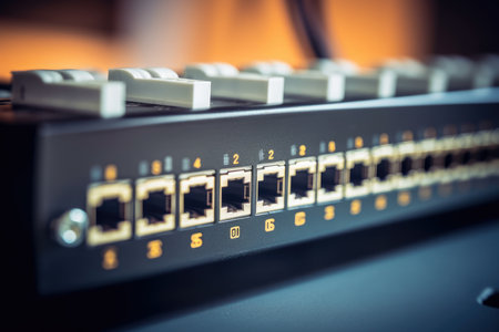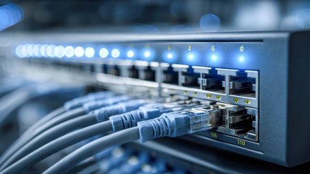 Detailed close-up of a network switch featuring neatly arranged ethernet cables, showcasing advanced technology in a contemporary office environment for efficient data connection.