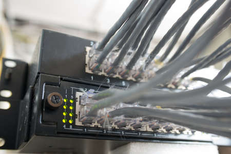 Detail of RJ45 Lan Cables and lights on network switches. Macro Shot