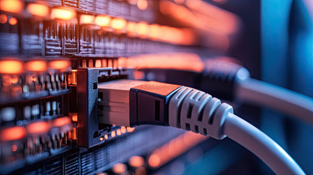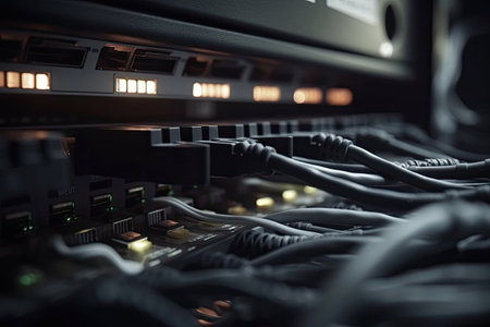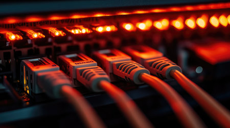 Close-up view of network cables connected to switches with glowing led indicators, symbolizing data transfer, connectivity, and technology in a modern data center environment. Generative AI