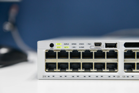 Network switch front panel with ports. Modern telecommunication equipment.