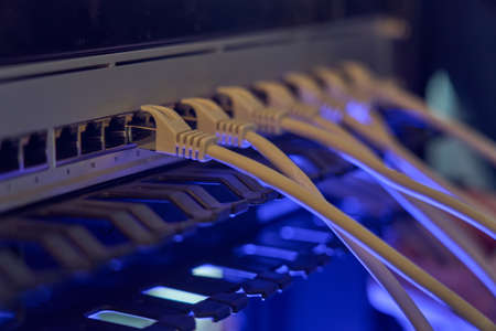 Server room with computers for internet. Network cables connected to switches. Data center.