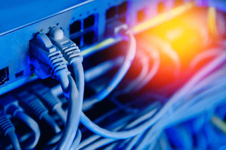 Business Network panel with switch and cable rj45 in data center blue background. Concept connector interface, sun light