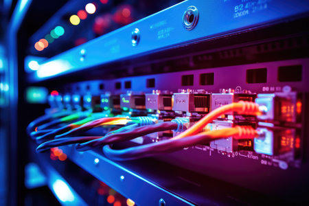 A vibrant close-up of a patch panel in a modern network rack, showcasing cables and connections. The colorful illumination adds depth to the technology theme.