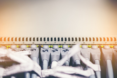 Network panel and switches with cables in data center room for optimal network management