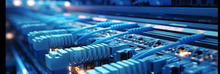 Network cables connected to a switch (blue tone)