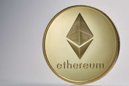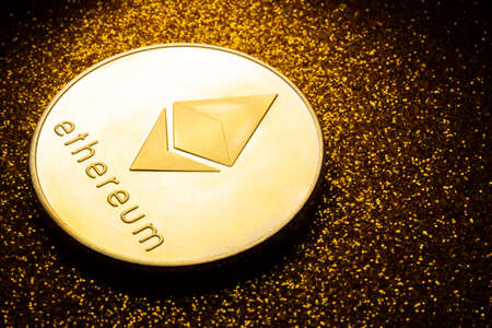 Close up shot of a golden Ethereum digital cryptocurrency.