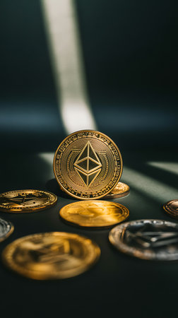 Digital currency physical grey Ethereum coin near gold bitcoins.