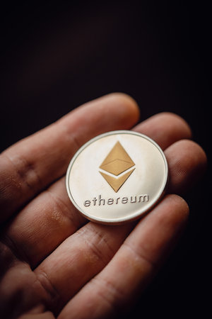 Ethereum cryptocurrency in hand, blockchain technology decentralized currency coin