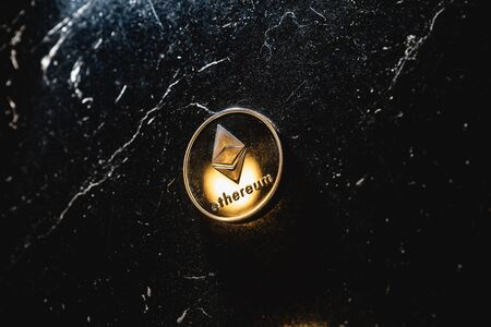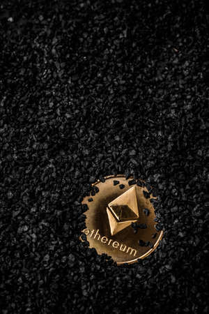 Ethereum coin on black gravel background. Cryptocurrency blockchain money