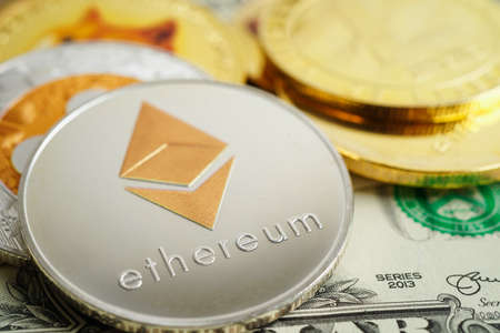 Ethereum coin on a us dollars and on the tablet with golden coins. Bitcoin crypto currebcy on US dollars. Digital currency. Virtual money. Metal coins of bitcoin on banknotes. Bussiness, commercial.