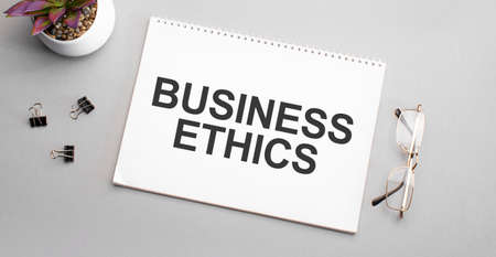 BUSINESS ETHICS is written in a white notebook next to a pencil, black-framed glasses and a green plant.