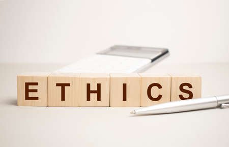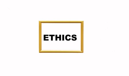 The word ETHICS is written on a golden beautiful frame and on a white background.