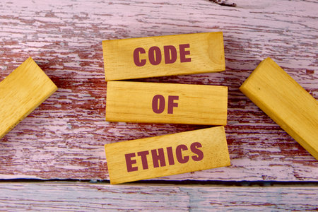 Code of ethics text on table, concept. code of ethics word written a conceptual phrase on wooden blocks lying on old boards