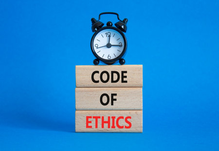 Code of ethics symbol. Concept words Code of ethics on wooden blocks with alarm clock. Beautiful blue background. Business and Code of ethics concept. Copy space.