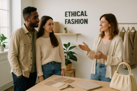 Fashion designer presenting fabric samples to couple visiting her studio, talking about ethical fashion
