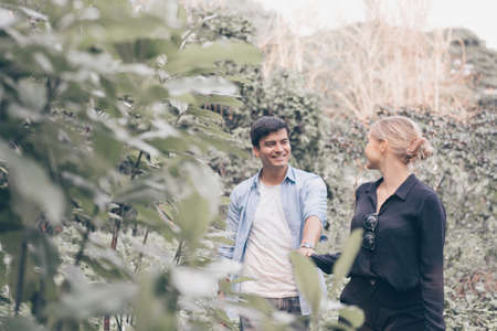 Young photographer with photocamera and his assistant with tablet having discussion of details of shooting of commercial