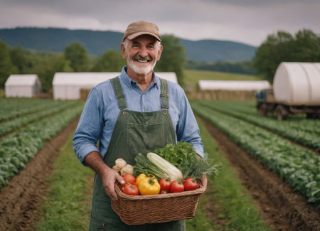 female farmer working early on farm holding wood basket of fresh vegetables and tablet