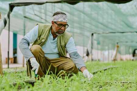 Elderly man tending to plants in greenhouse wearing glasses and bandana on head carefully maintaining rows of greenery in professional manner