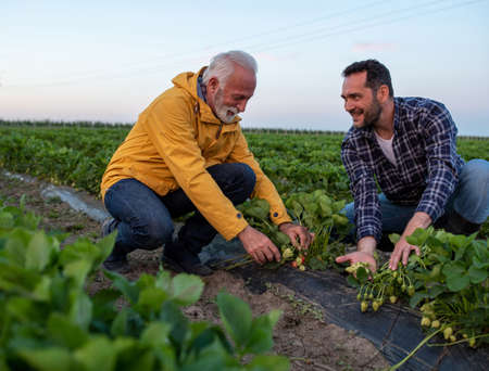 Two farmers crouching in field looking at strawberries. Men showing inspecting fruit proud satisfied smiling.