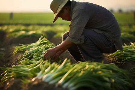 agriculture fields with farmer working at sunrise the crops on sunny day