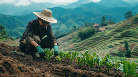 A dedicated farmer plants saplings in a lush mountainous field, showcasing sustainable agriculture and the beauty of nature in rural landscapes.