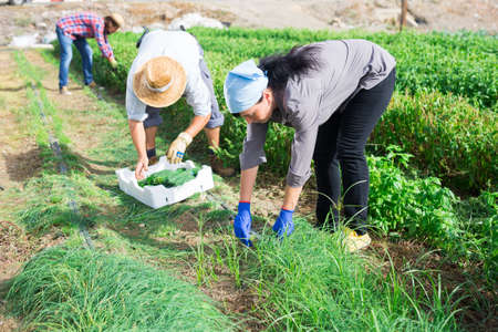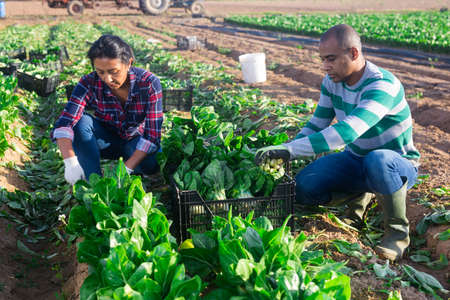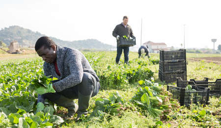 Latino farmers together harvest chard on field