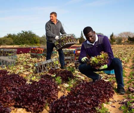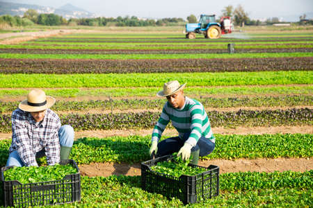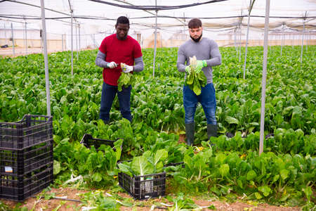 Men professional gardeners during harvesting of lettuce outdoor