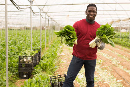 Successful horticulturist showing harvested chard on farm plantation