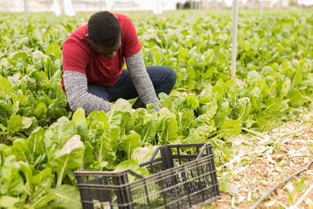 African American workman cutting spinach on field