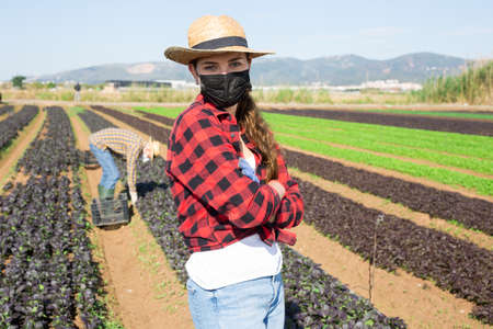 Female gardener in protective mask harvests green canonigos on plantation