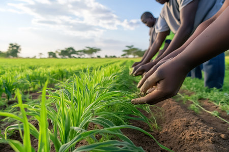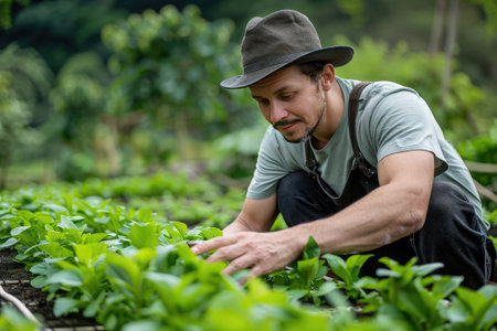 A gardener tends to young green plants in nutrient rich soil during bright daylight nurturing growth in a flourishing garden.