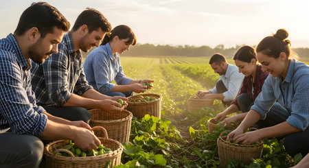 Farmers harvesting vegetables or fruits in a farmer's field in early autumn in sunny day. Generated AI. Top view.
