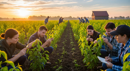 Young farmers examing planted young corn in spring
