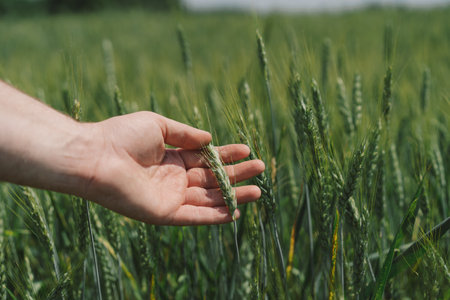 Closeup man hand holding gently wheat spikelet on sunrise. Fingers touching unripe green grain on farm field. Unrecognizable farmer checking crop quality on evening sunlight. Agriculture concept.