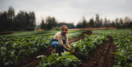 african american happy woman smiling in field harvesting summer vegetables.