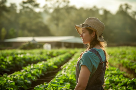 A contemplative young woman in farm attire enjoying the peacefulness of the fields in the golden hour.