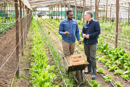 A farmer and agricultural engineer working in organic green farm or garden center in the countryside. Diverse entrepreneurs checking plant growth and harvesting produce, holding digital tablet.