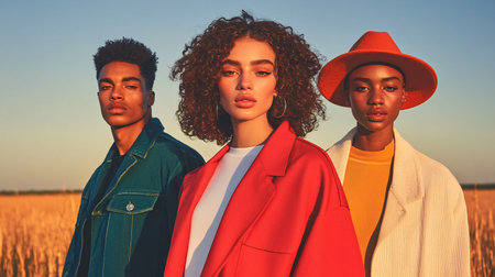 Three stylish young adults dressed in colorful outfits posing confidently in a golden field at sunset with beautiful lighting.