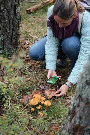 Caucasian woman in the forest cuts the honey mushrooms or Armillaria mellea.