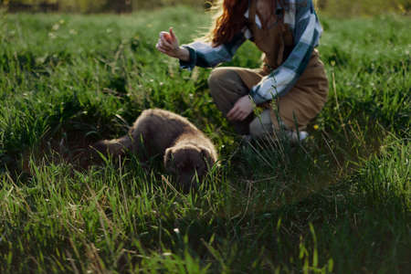 Young redheaded woman playing in nature with her dog in sunny park at sunset in summer