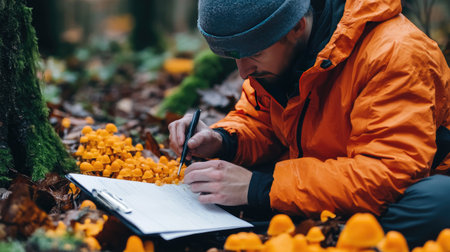 A focused researcher examines bright orange mushrooms while taking notes in a lush forest. This image highlights the beauty of nature and the joy of scientific discovery.