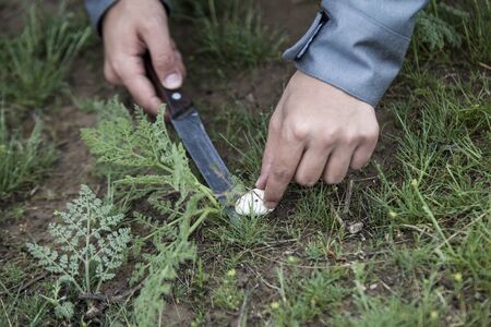 Close up of a hands of a man cuting a mushroom in the forest