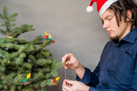 Hanging Christmas decorations and ornaments in the Christmas tree